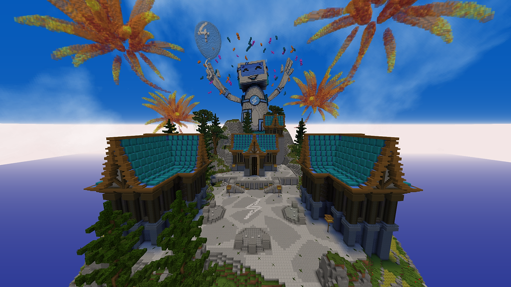 我们的 “中世纪农耕岛 “建造4周年特别改版。一个精心装饰的中心,有无数的箱子和NPC的区域,盯着我们都知道和喜欢的那个人,扎普拿着一个气球,在高空中放着烟花。